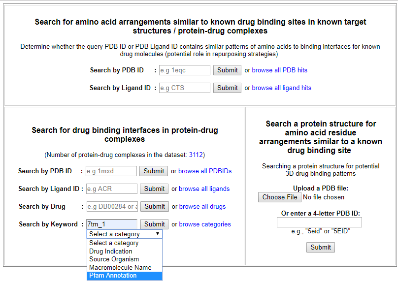 From the ‘Search for drug binding interfaces in protein-drug complexes’ interface, keyword search for ‘7tm_1’ under 'Pfam annotation' category returns a list of known binding sites from proteins with Pfam annotation '7tm_1' or PF00001. User may filter the list based on ligand name or number of residues.